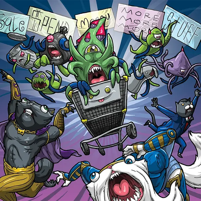 Funghulhu came to this planet billions of years ago as a mere spore drifting on cosmic winds, having to start a whole new collection after he entirely consumed and depleted his previous planet. By now his collection is so vast and inimaginable that it would shatter the very sanity of a mere human mind! Luckily for the Apocalypse Cats, the collection is as comprehensible as it is destructible. But they must work diligently and strategically to continuously fight back his fungal growths before they consume all of Domexus!